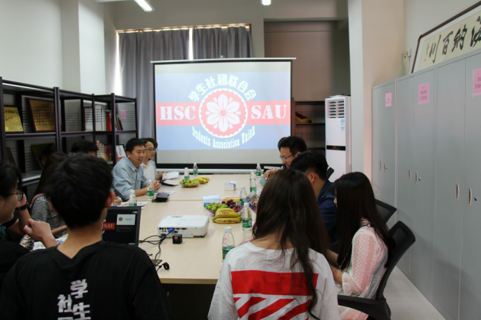 我院社联负责人为来宾播放了我院社团建设的介绍视频,接着通过PPT讲解《怎样做好校园公众号》,努力打造好网络宣传阵地。两校学生代表随后进行深入交流学习,在社团管理上进行探讨并交换了意见。