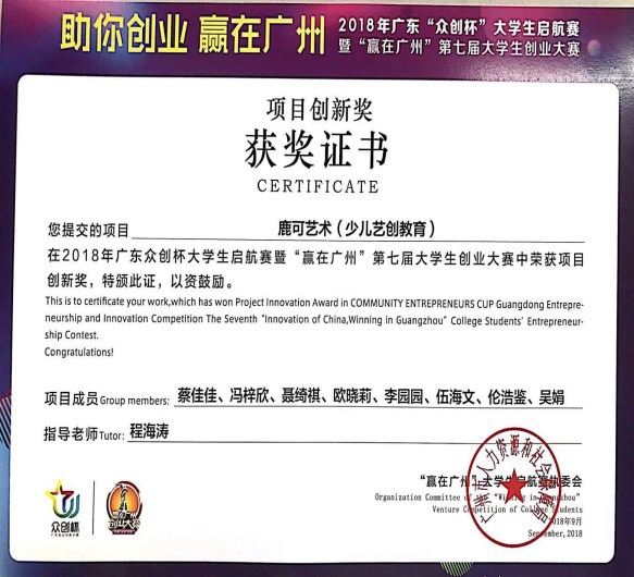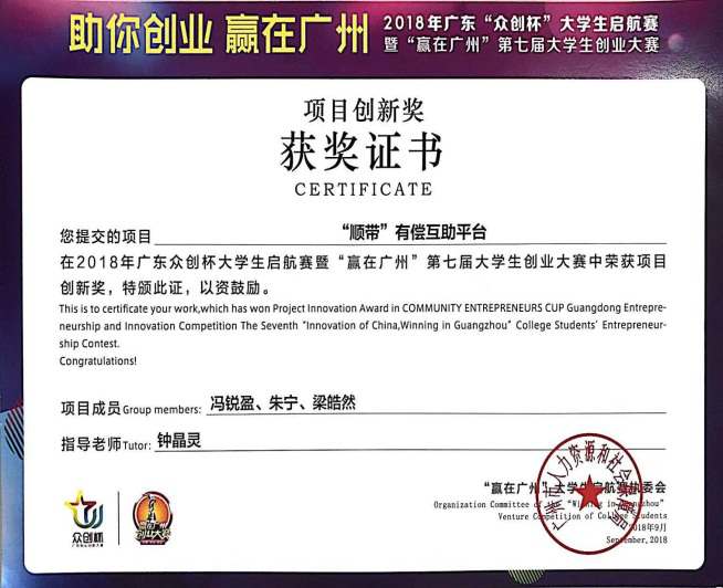 我院两个项目《“顺带”有偿互助平台》、《鹿可艺术(少儿艺创教育)》在2018年广东“众创杯”大学生启航赛暨“赢在广州”第七届大学生创业大赛中,荣获“项目创新奖”。永利官网创业教育学院获“优秀组织奖”。