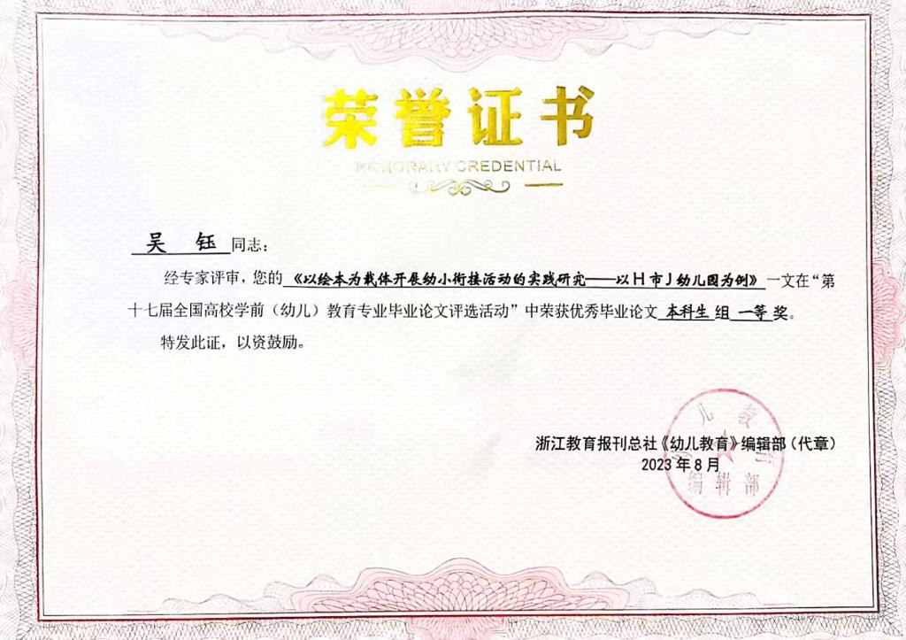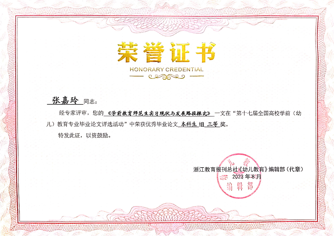 近日,由浙江省教育报刊总社《幼儿教育》编辑部主办的第十七届全国高校学前(幼儿)教育专业优秀毕业论文评选活动结果揭晓。yL23411永利vip官网登录入口教师教育学院学前教育专业选送的论文分别荣获本科生组一、二、三等奖。