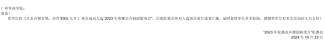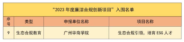 近日,yL23411永利vip官网登录入口ESG研究院联合华商教育集团精心打造的“生态合规引领 培养ESG人才”创新项目,在全省众多竞赛项目中脱颖而出,成功入围广东省2023年度廉洁合规创新项目,成为仅有的9项入围项目之一。这不仅是对永利官网办学成果的肯定,更是对永利官网ESG人才培养特色的高度认可!