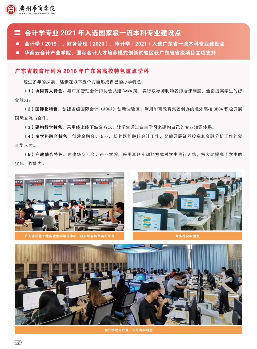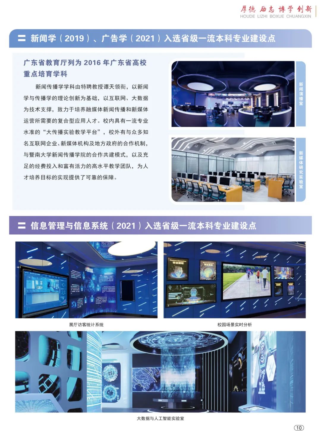 学校设立16个省级、校级研究院(所),助力产、学、研协同发展,以“二协同、五融合”为人才培养模式,实施校企协同育人,致力于实践教学体系、产教融合、校企合作建设的探索。校内已建成5个高标准、高水平的广东省质量工程实验教学示范中心——经管学科跨专业综合仿真平台、大传播实验教学平台、计算机实验中心、艺术设计实验中心,以及医药健康、数字金融、大数据与人工智能互动等实验平台,不断提高学生的应用能力和就业创新能力。