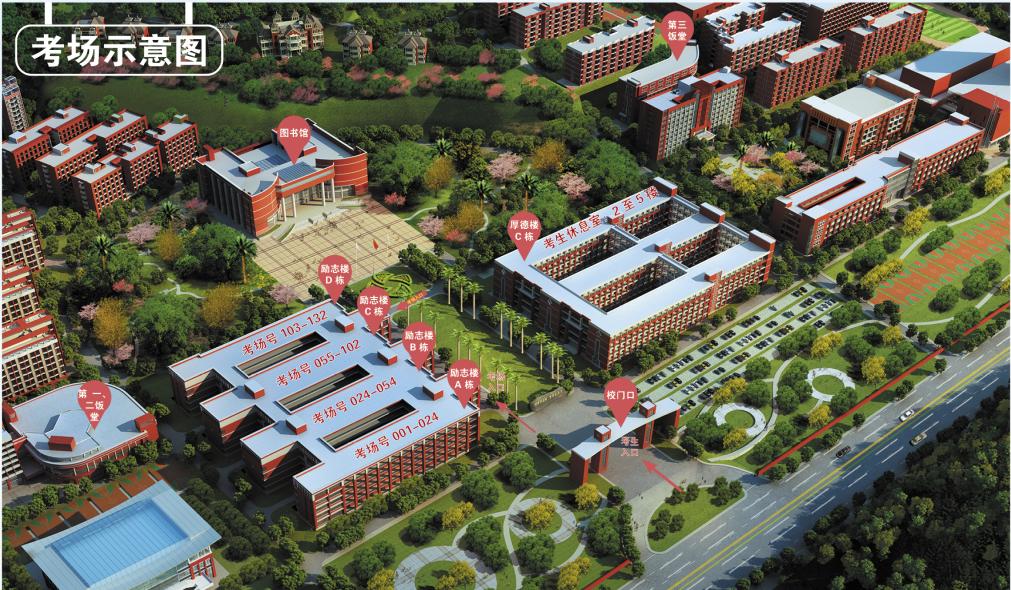 考生分散有序进入考点后,请按指引路线行走,根据考场分布图和沿途指引找到所在考场,并在考场外空旷处等候。得到允许进入考场的指令后,按照现场工作人员指引,安全、有序进入各楼栋入口进行“人脸识别身份验证”。