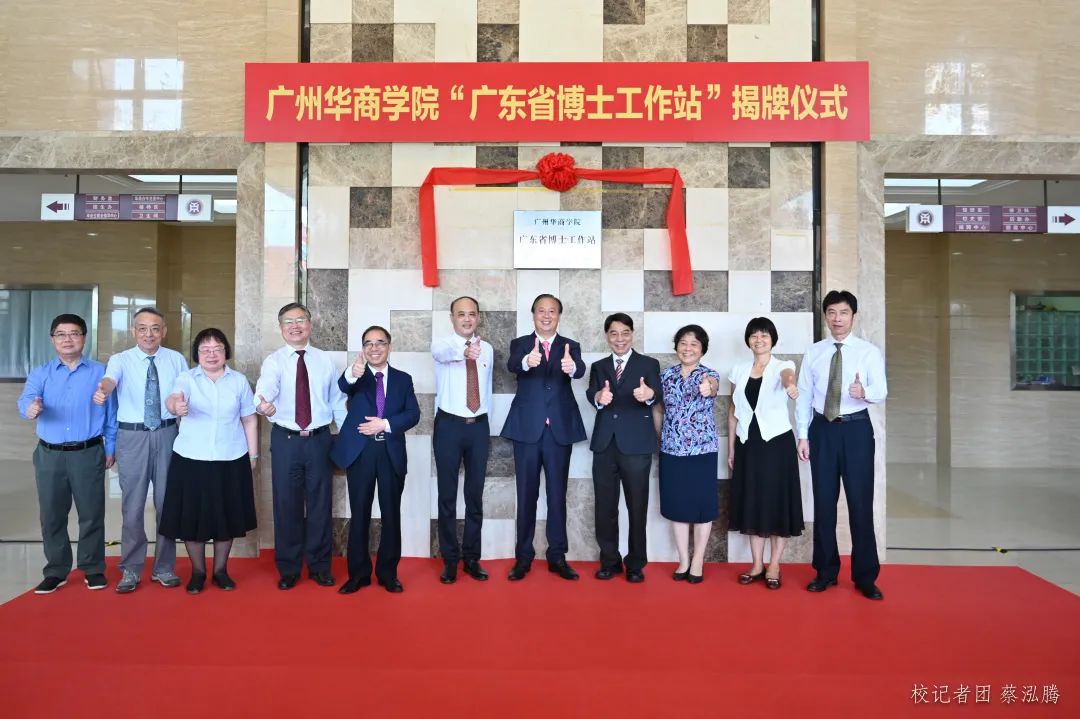党委书记苏宁宣读《关于在广州市胸科医院等224家单位设立广东省博士工作站的通知》,廖榕就董事长、陈新滋院士及全体校领导为华商学院博士工作站揭牌。
